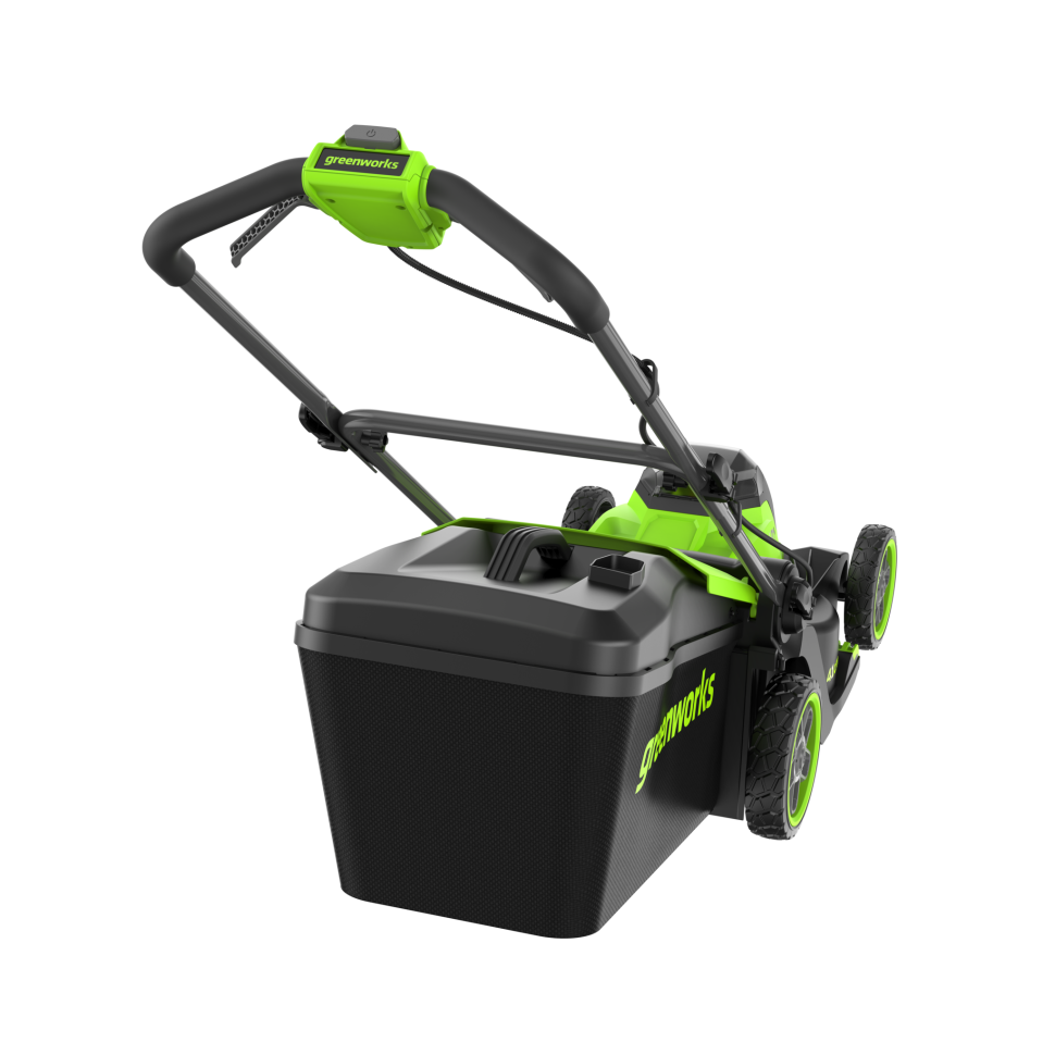 Модель 2025 года с обновленным дизайном: комбинированный травосборник с жесткой верхней частью с индикатором заполнения и мягкой складной нижней частью для удобства хранения, новая эргономичная конструкция выключателя, новые стильные колеса.