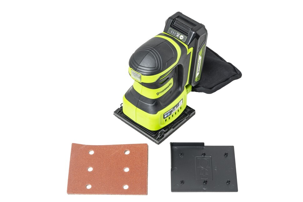 Плоскошлифовальная машина аккумуляторная Greenworks (3100507), 24 В, без АКБ и ЗУ предназначена для шлифовки поверхностей из древесины, пластика, металла.