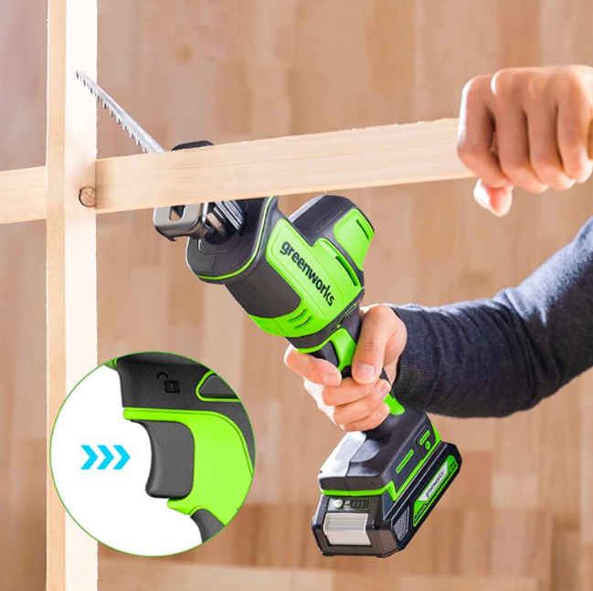 Выключатель с защитой от случайного пуска, защита от перегрузки / перегрева, плавный пуск – компактная аккумуляторная сабельная пила Greenworks GPT-CRS-25 безопасна и комфортна в работе.